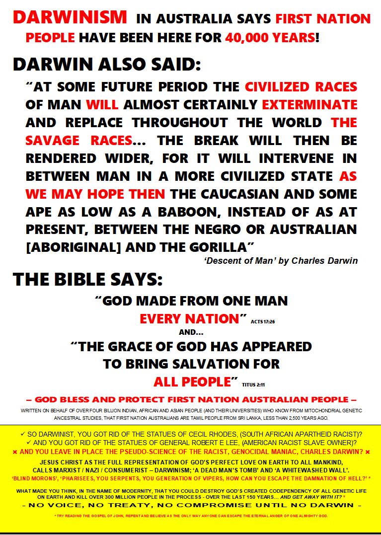 No Voice – No Treaty – No Compromise until NO DARWIN TO DOWNLOAD A3 POSTER CLICK ON THE LINK BELOW: DARWINISM IN AUSTRALIA SAYS FIRST NATION PEOPLE… Share this: Click to share on X (Opens in new window) X Click to share on Facebook (Opens in new window) Facebook Like Loading...